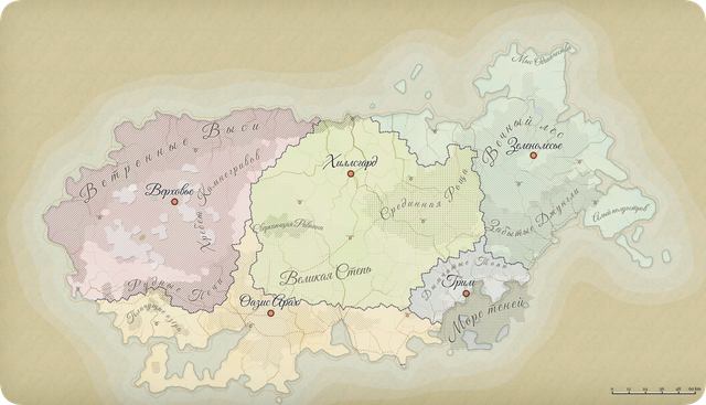 Континент, на котором расположены основные поселения, отличается исключительным разнообразием природных зон. Его рельеф формируется сложной сетью горных хребтов, древних плато, обширных равнин и систем подземных вод. Поселения находятся почти на одинаковом расстоянии друг от друга, образуя условный пятиугольник по территории континента — путь между ними занимает от трёх до семи дней в зависимости от направления и времени года. Существуют также более быстрые способы перемещения между поселениями, но они, как правило, подходят одиночным путникам и не подходят караванам.