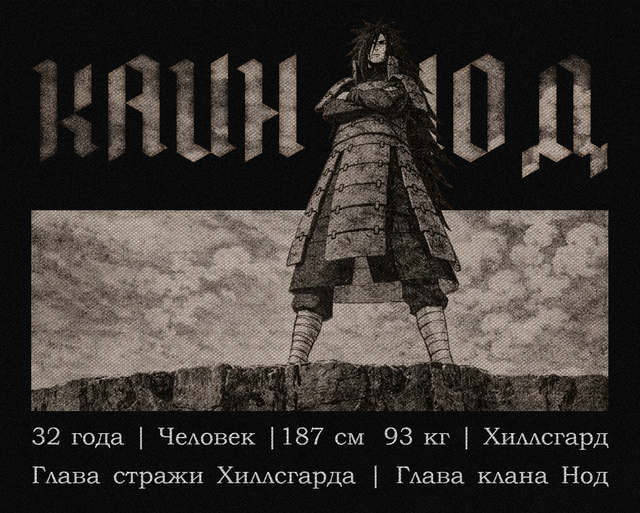 Эмоциональный отдых он находит в одиночестве, сознательно избегая длительного пребывания в толпе, которая лишь усиливает его внутреннее напряжение. В рабочем кабинете или во время размышлений ему необходима либо абсолютная тишина, либо монотонный, глухой шум, чтобы заглушить голос совести и сосредоточиться на стратегии. Каин обладает немигающим, тяжелым и проницательным взглядом, который редко отводит в разговоре, что делает его манеру слушать слегка пугающей и заставляет собеседников чувствовать себя полностью изученными. Помимо поста Главы Семьи, Каин занимает ключевую официальную позицию — он является Главой Стражи Хиллсгарда. Эта должность, полученная им вскоре после восхождения к власти, позволяет ему легально контролировать передвижения в городе, получать прямую информацию о беспорядках и инцидентах, а главное — манипулировать силовой структурой, минуя необходимость прямой конфронтации с кланом Гроссблад. Несмотря на тайное убийство брата, Каин искусно использует образ Авеля «Миротворца» в публичном пространстве. Он не пытается очернить память предшественника — напротив, он поддерживает миф о Авеле как о благородном, но наивном лидере, павшем жертвой чужой гордыни, что косвенно бросает тень на представителей верхушки Грима и отводит подозрения от самого Каина. Однако за этим холодным расчётом скрывается глубокое сожаление о содеянном. Восхваляя брата, Нод поступает так не только из личной выгоды, но и в качестве самоискупления, попытки смягчить тяжесть ужасного поступка — в этом он сам себя убеждает. Глава семьи Нод считает, что жертва Авеля была необходима для возрождения их клана. Глядя на слабость нынешних порядков, Каин всё чаще склоняется к мысли, что именно его твердая рука должна стать основой будущего благополучия Хиллсгарда.